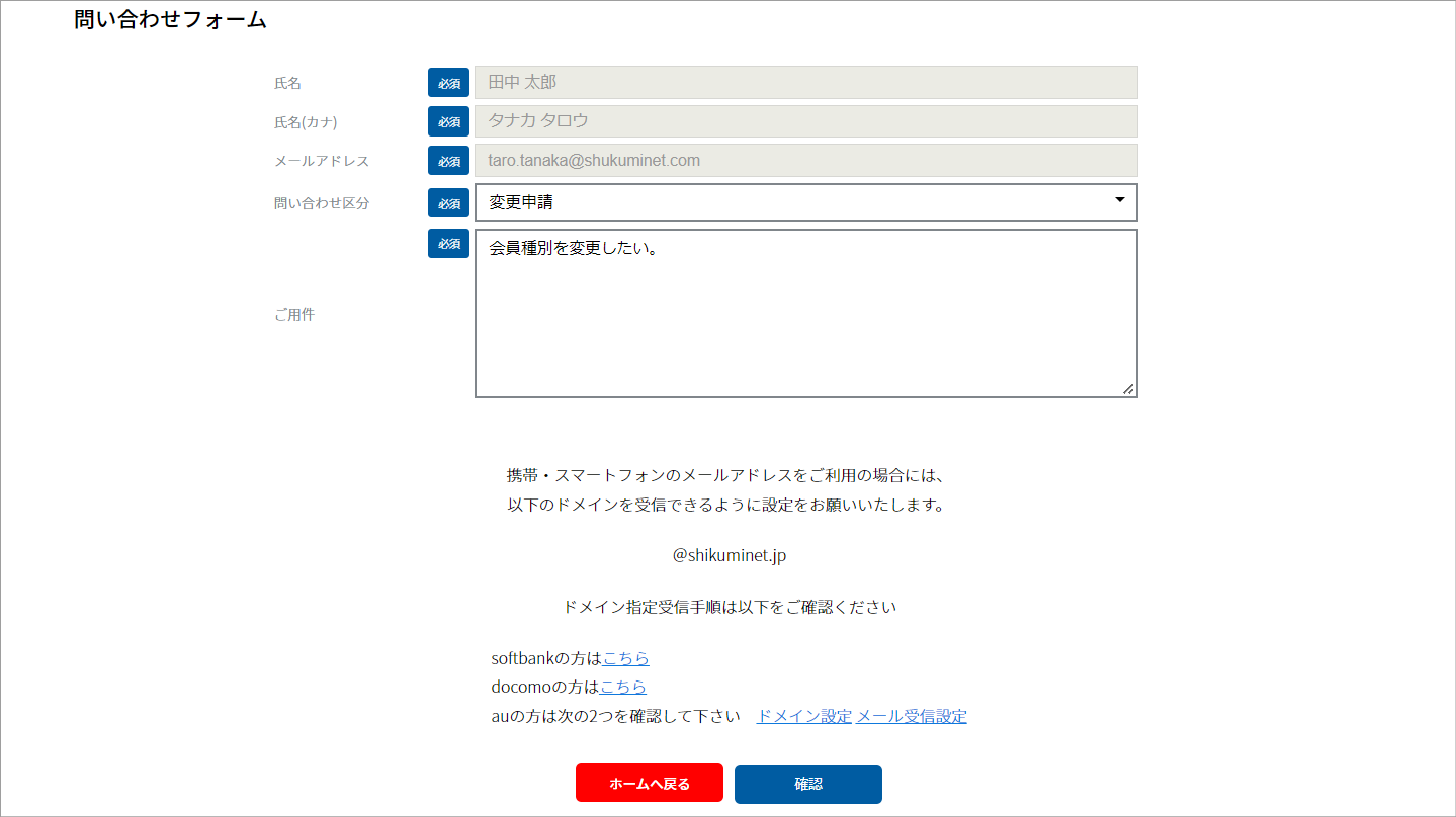 ⑤お問い合わせ内容を入力し、「確認」をクリックします。